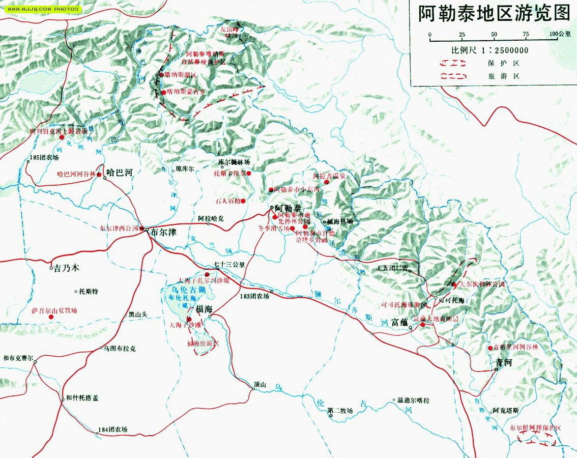 阿勒泰地區(qū)有高山森林、河谷風光、湖泊溫泉、巖畫石刻等旅游資源數(shù)量為185處。這里有美麗的喀納斯湖風景區(qū)、布爾根河河貍自然保護區(qū)、福海海濱風景區(qū)、蝴蝶溝、烏倫古湖海濱浴場、白沙湖、鳴沙山,以及高山風光、冰川雪嶺、湖泊溫泉、巖畫石刻,切木爾切克古墓群及草原石人阿勒泰市四面環(huán)山,地形奇異。