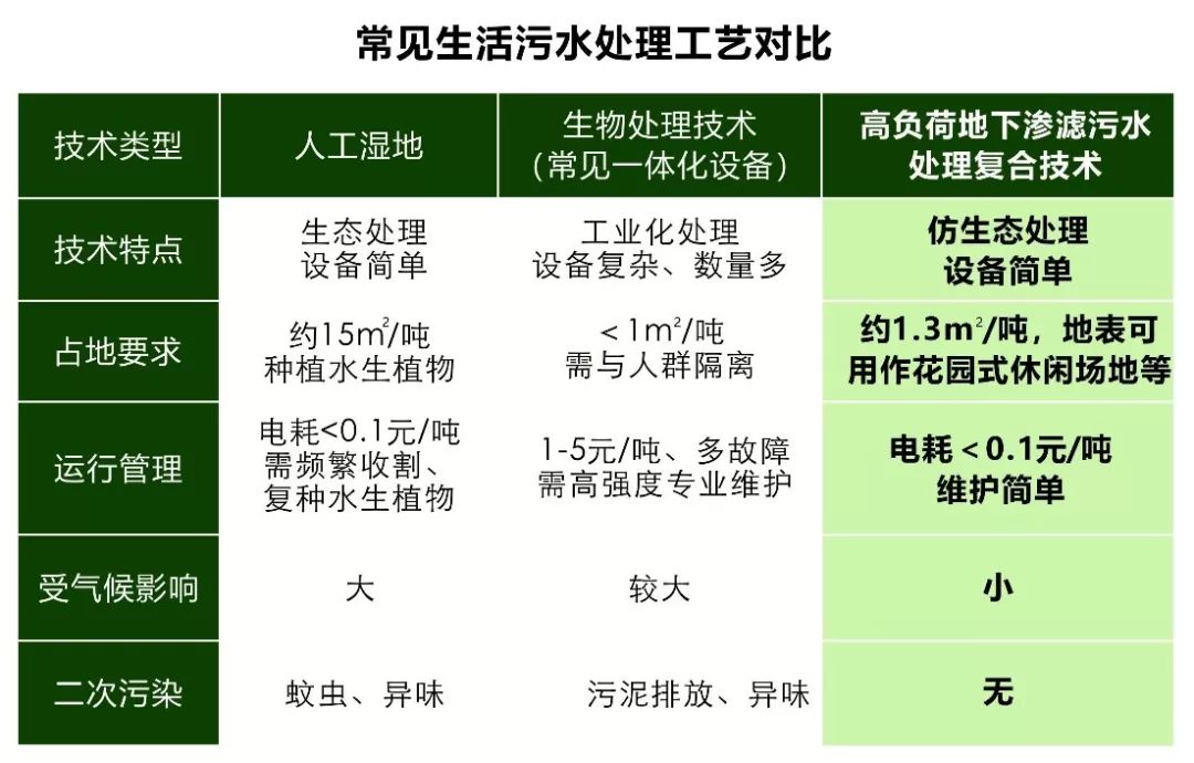“高負(fù)荷地下滲濾技術(shù)”作為仿生態(tài)技術(shù),在保留了“傳統(tǒng)地下滲濾”傳統(tǒng)地下滲濾主要優(yōu)點(diǎn)的同時(shí),克服了生化處理技術(shù)設(shè)備多、能耗高、需要專業(yè)維護(hù)等主要缺點(diǎn);同時(shí)又解決了生態(tài)處理技術(shù)占地面積大,冬季無(wú)法正常運(yùn)行的重大缺陷。